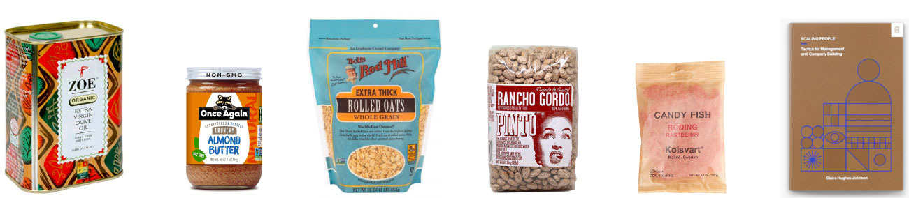 Zoe EVOO (in the tin), Once Again crunchy almond butter, Bob's Red Mill extra thick rolled oats, and at least three pounds of Rancho Gordo beans.