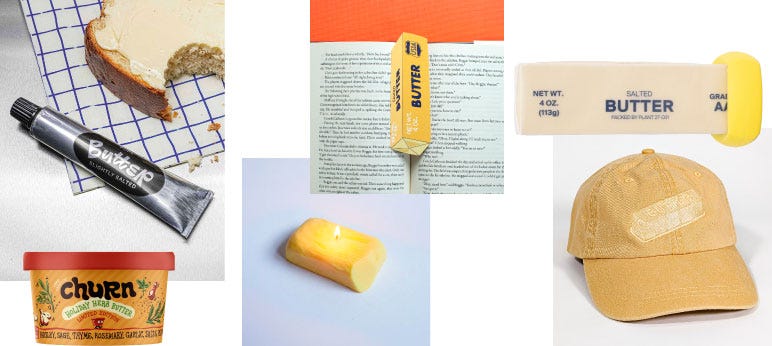 This butter tube must’ve been such a fun project to work on. Can we get squeezable butter for real now? But thank goodness “fun squeeze” colored liquid margarine didn’t make it past the early 2000s, feeding that to children should be illegal. Did you also miss that I Can’t Believe It’s Not Butter was briefly rebranded to I Can’t Believe It’s So Good? No matter how you spin it, I think we can all believe it’s not butter. Everything Churn makes looks bomb, but I’m going to start with this Holiday Herb Butter because ‘tis the season. Currently using this stick of butter bookmark in my copy of “Dark Money” (i’m in a billionaire rabbit hole after finishing “The Fund” the other week). I think you need this butter tree sculpture for your holiday party. Butter is having a moment in art, fashion and art direction. This week I finally learned what butterscotch actually is (spoiler alert, it’s not butter mixed with scotch). Gift ideas for the butter lover in your life (even if that’s you): earrings, candle, dad hat, butter hugger, art print.